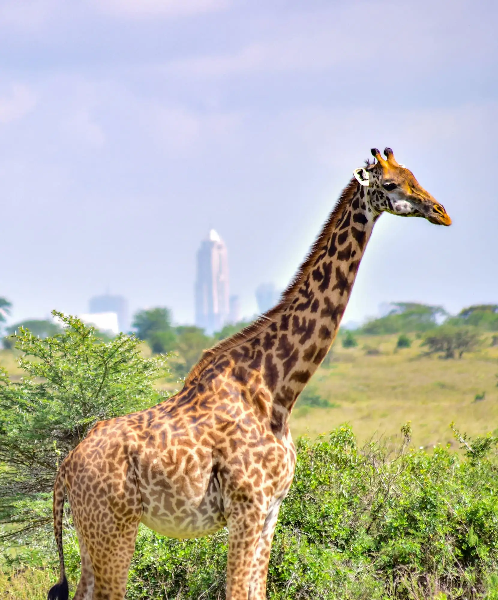 Pocas escenas resumen mejor qué ver en Kenia que una jirafa con rascacielos al fondo. El Parque Nacional de Nairobi es único en el mundo, ya que permite observar leones, rinocerontes o cebras con la silueta urbana detrás.