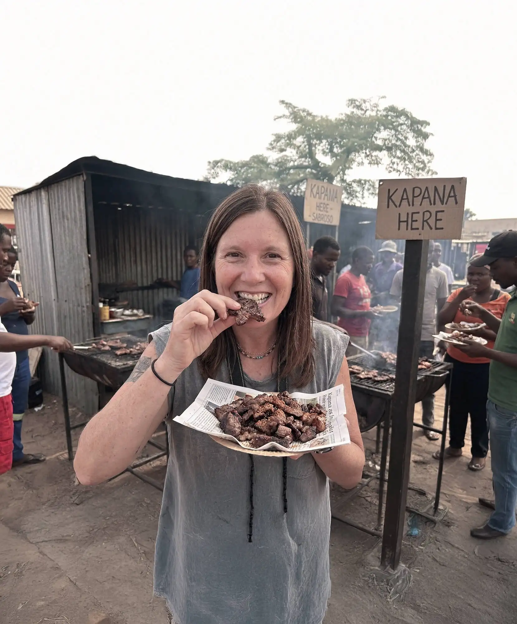 Si hay un plato que representa el alma namibia, ese es el kapana. Yo lo encontré en casi cualquier mercado o esquina bulliciosa: trocitos de carne, generalmente de res, asados a la parrilla y servidos directamente desde el fuego.