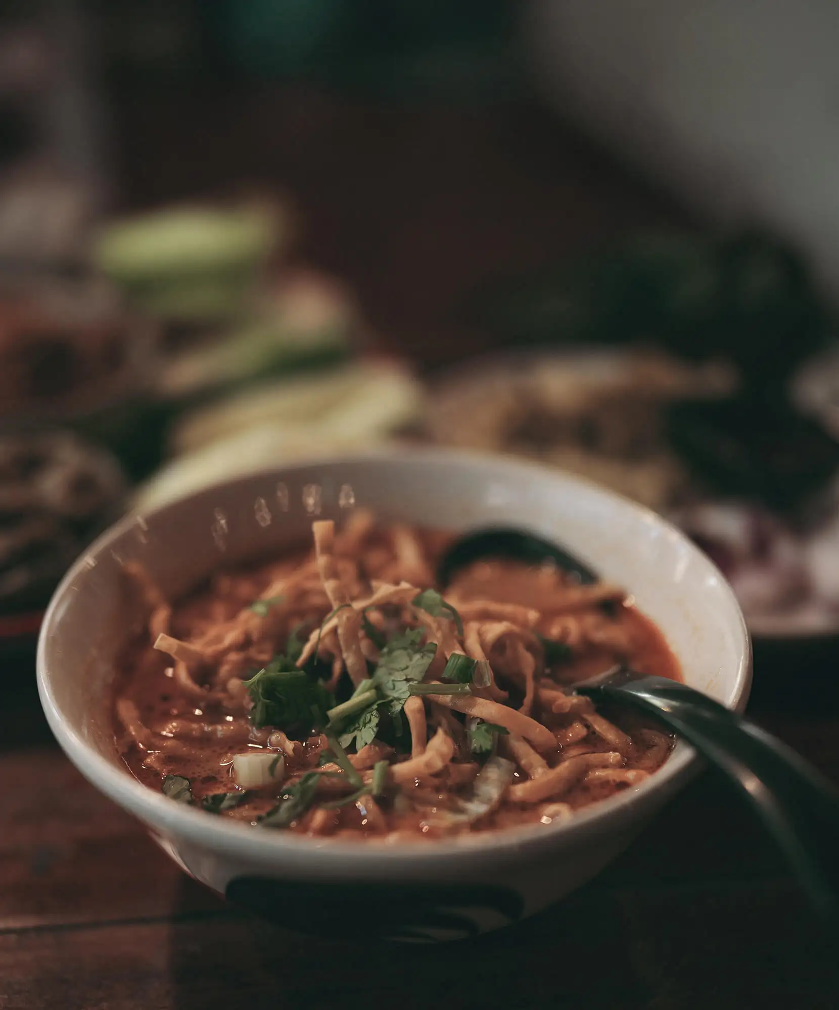 Se acompaña de pollo, cerdo o ternera, además de cebolleta, lima y cilantro. Es un plato profundo y especiado que reconforta después de un día intenso recorriendo templos o mercados.